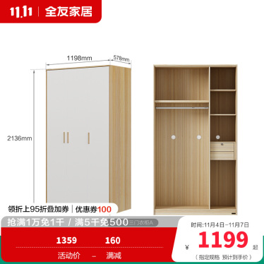 全友家居北欧现代三门衣柜 清新木纹带L灯储物收纳衣橱卧室整体家具 【腊木木纹A款】三门衣柜
