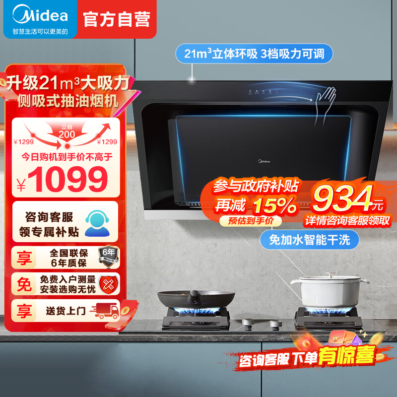 美的(Midea)抽油烟机家用厨房侧吸式吸油烟升级21m³大吸力自动清洗挥手智控脱排油烟机CXW-260-JP32