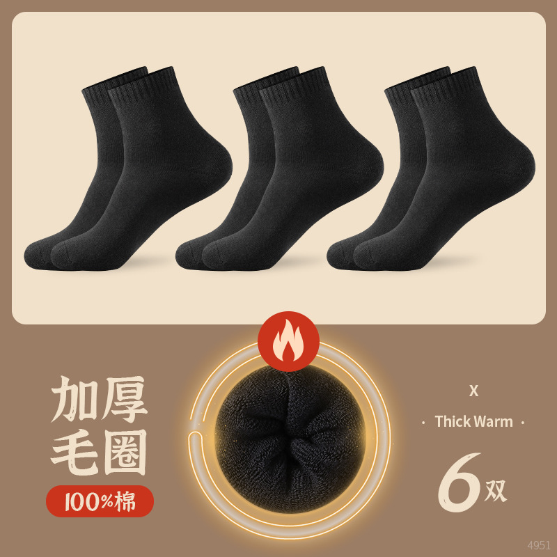 恒源祥男士袜子冬季棉袜中长筒纯棉加绒加厚保暖毛圈袜男袜子冬天_49 均码【100%纯棉,加厚保暖】 4951【6黑色】毛圈男袜6双