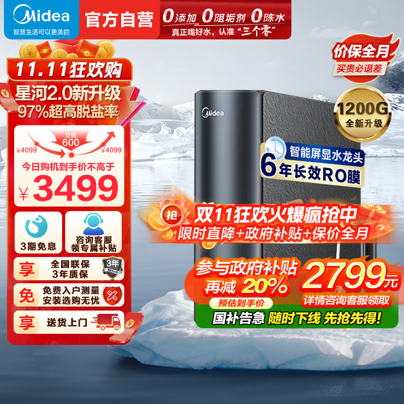 美的(Midea)净水器家用净水机1200G 星河2.0净矿净水器双水直饮 触控式龙头6年RO反渗透矿物质厨下式净饮机