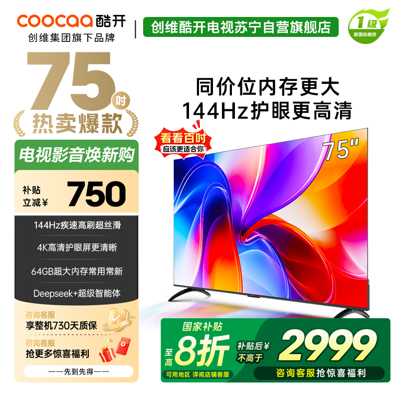 创维酷开电视75K3 2025款144Hz高刷|4K高清护眼屏|64GB超大内存 75P3F