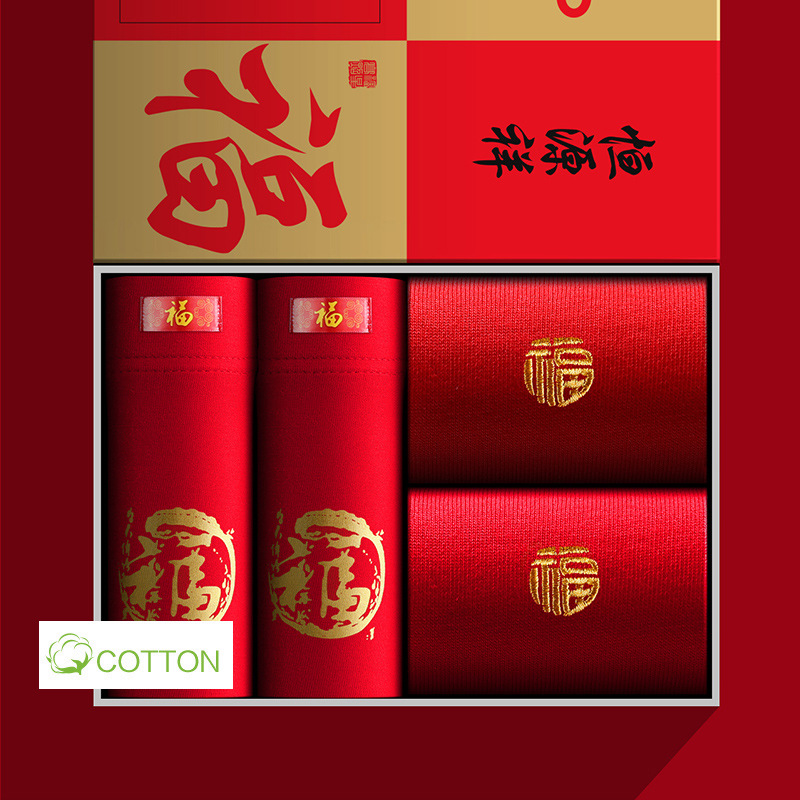 恒源祥男士内裤本命年属虎年四角短裤头纯棉大红色结婚平角裤_368 175/XL C款【2内裤2袜子】牛气冲天