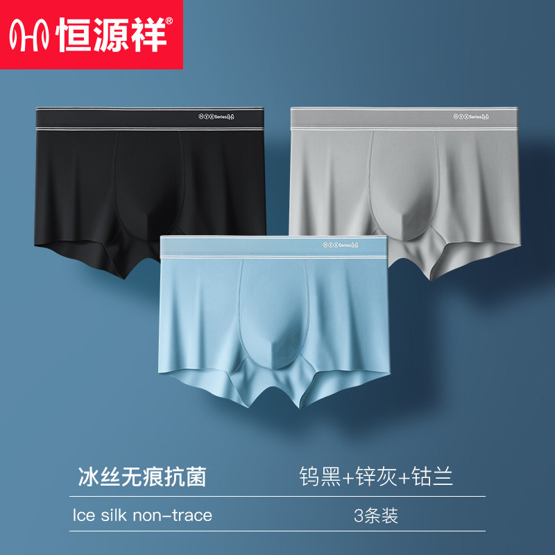 恒源祥男士内裤冰丝无痕薄款透气莫代尔男生四角平角裤头夏季潮流 180/2XL 3条【无痕抗菌】钨黑/锌灰/钴兰