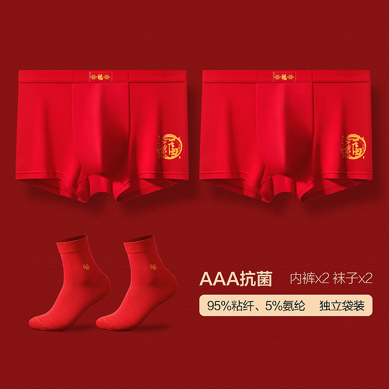 恒源祥本命年内裤男士平角裤纯棉大红色属虎年结婚四角短裤头_22 180/2XL 【2内裤2袜子】福星高照