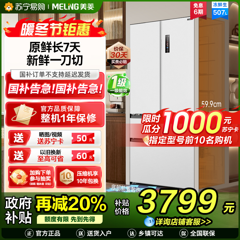 美菱冰川白冻鲜生507升恒温鲜冻法式超薄嵌入家用冰箱双系统双循环一级能效国家补贴BCD-507WPU9CDZ