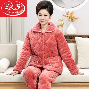 浪莎冬季珊瑚绒夹棉睡衣女中年妈妈中老年秋冬季三层加厚加绒保暖棉袄 NJR-XP504 3XL码适合160-180斤