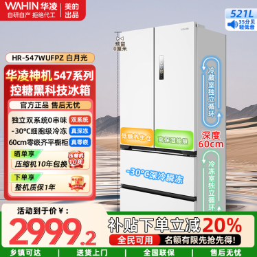 美的出品华凌神机60cm薄零嵌入法式多门双系统双循环全空间净味家用一级能效冰箱HR-547WUFPZ白月光 家电国家补贴