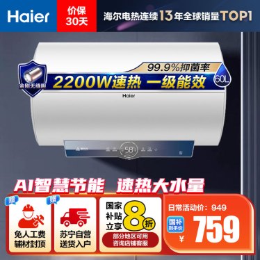 海尔(Haier)[Eco1]60升电热水器 金刚搪瓷胆 国家补贴20%一级能效节能2200W高效加热长效保温抑菌