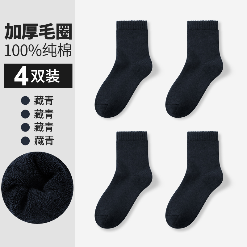 恒源祥男士毛圈袜子纯棉防臭秋冬季厚款加厚加绒毛巾底中筒袜_511 均码(38-44码) 【纯棉加厚加绒】4双藏青
