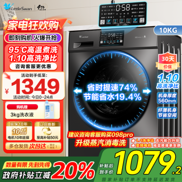 [苏宁自营]小天鹅滚筒洗衣机全自动变频10公斤大容量家用羽绒服洗除菌除螨 TG100V23PRO [洗净比1.1新款]