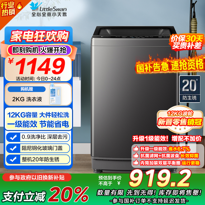 小天鹅(LittleSwan)波轮洗衣机全自动 12公斤大容量 免清洗不脏桶 [TB12-1809T]一级能效