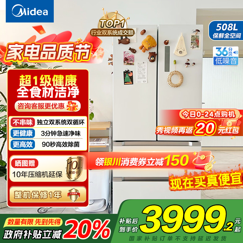[自营]美的(Midea)508变频一级能效法式多门双系统双循环除菌净味冰箱大容量BCD-508WTPZM(E)白国补
