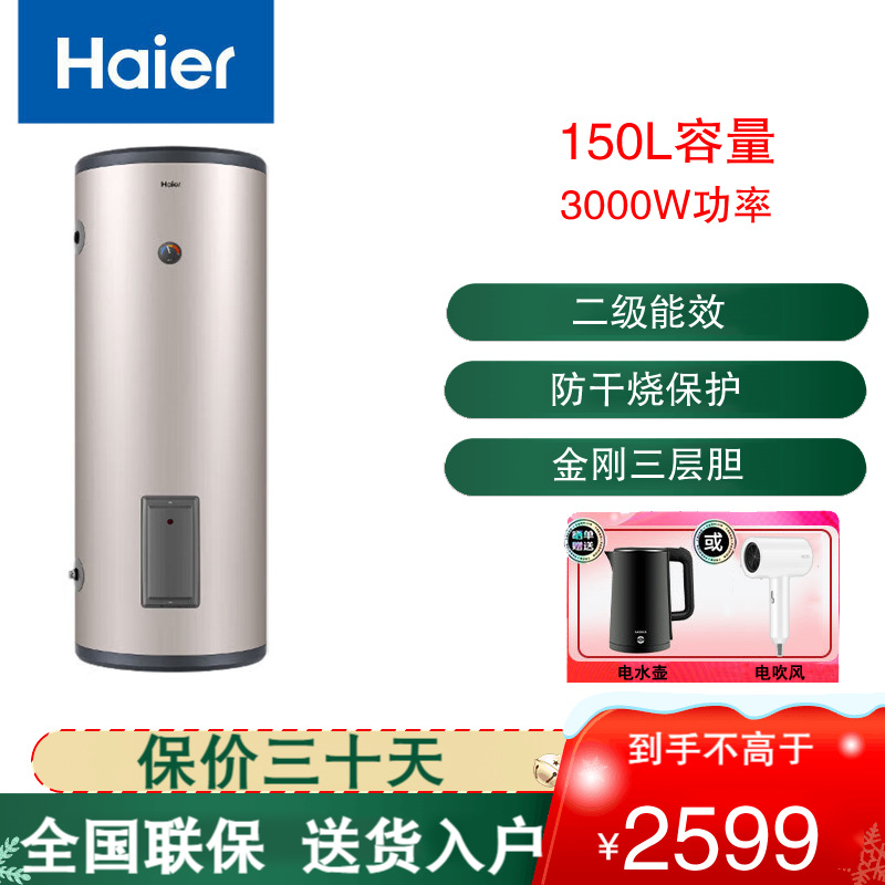 海尔(Haier)电热水器150升大容量落地式3KW大功率速热中央全屋供水大容量储水式商用家用 ES150F-LC