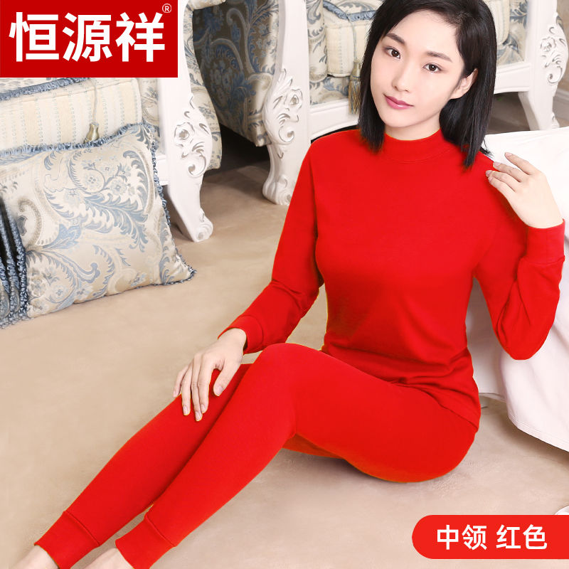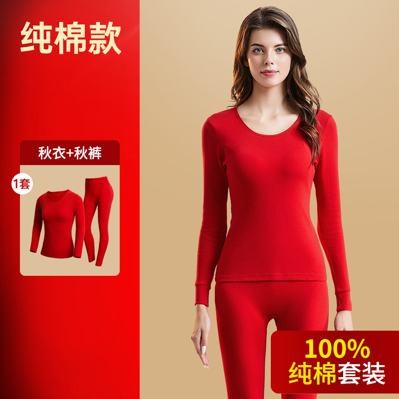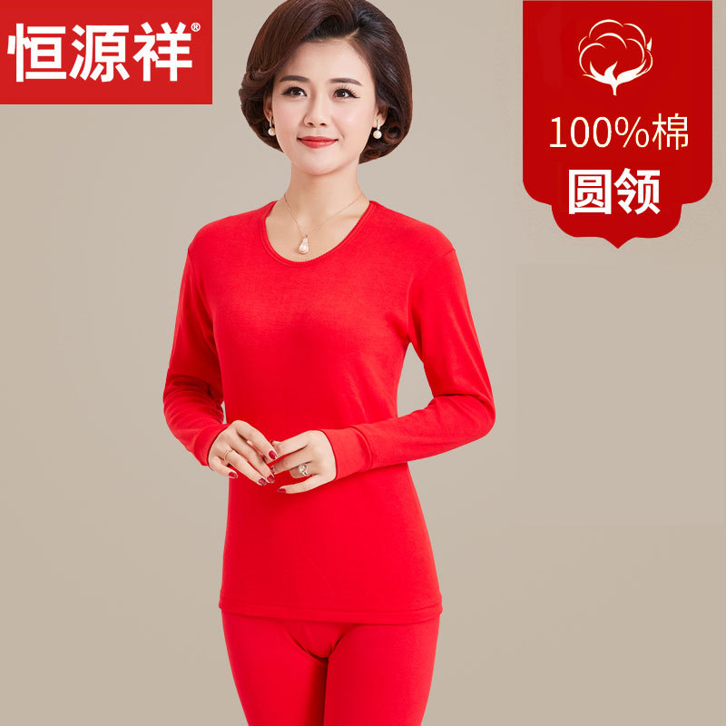 恒源祥虎年本命年套装大红色结婚女男士保暖内衣纯棉秋衣秋裤属虎_940 160(S) 女士纯棉内衣套装(圆领)