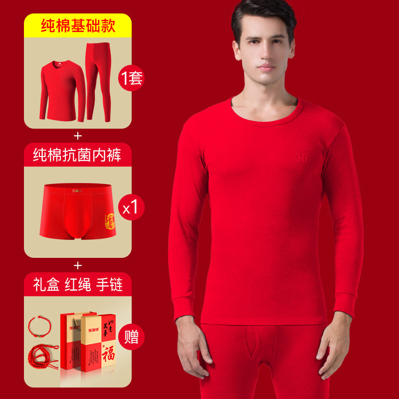 恒源祥本命年大红色结婚男士纯棉保暖内衣套装棉毛衫秋衣秋裤女_362_543 170/L 万事如意(鸿运纯棉圆领+内裤)男款