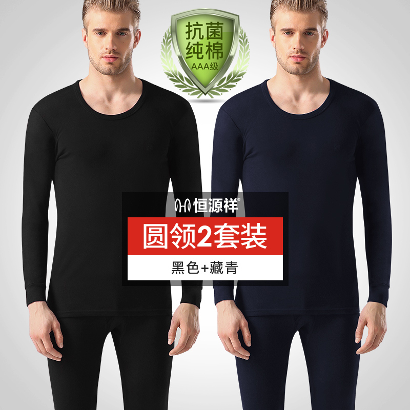 恒源祥保暖内衣男士秋衣裤秋裤套装青少年春秋薄款男生全棉毛衫冬_729_181 M/165【AAA抗菌100%纯棉】 【圆领】黑色+藏青