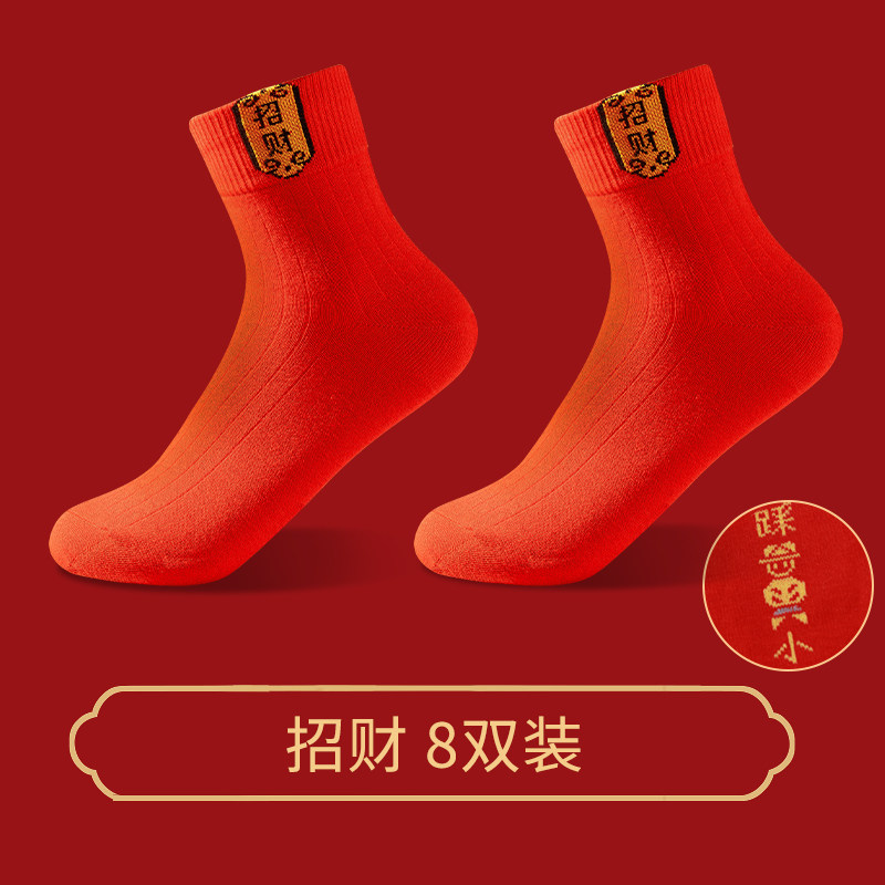 恒源祥红袜子女男士本命年属虎年中筒纯棉情侣结婚大红色秋冬_32 男款:招财进宝39-44CM 【8双装】招财x8