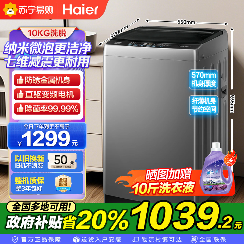 海尔(Haier)10公斤 变频 全自动 波轮洗衣机 1.0洗净比 纳米微泡净 除菌除螨 XQB100-BZ20B0