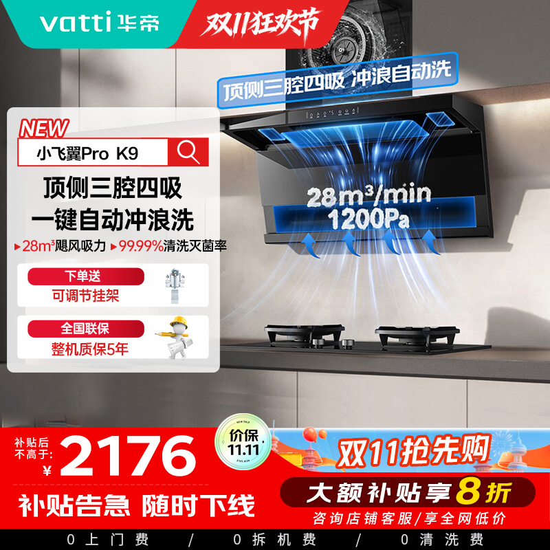 华帝(vatti)[小飞翼Pro K9]小飞碟28风量大吸力脱排油烟机 i111K9超薄平嵌7字型变频顶侧双吸三腔自动洗