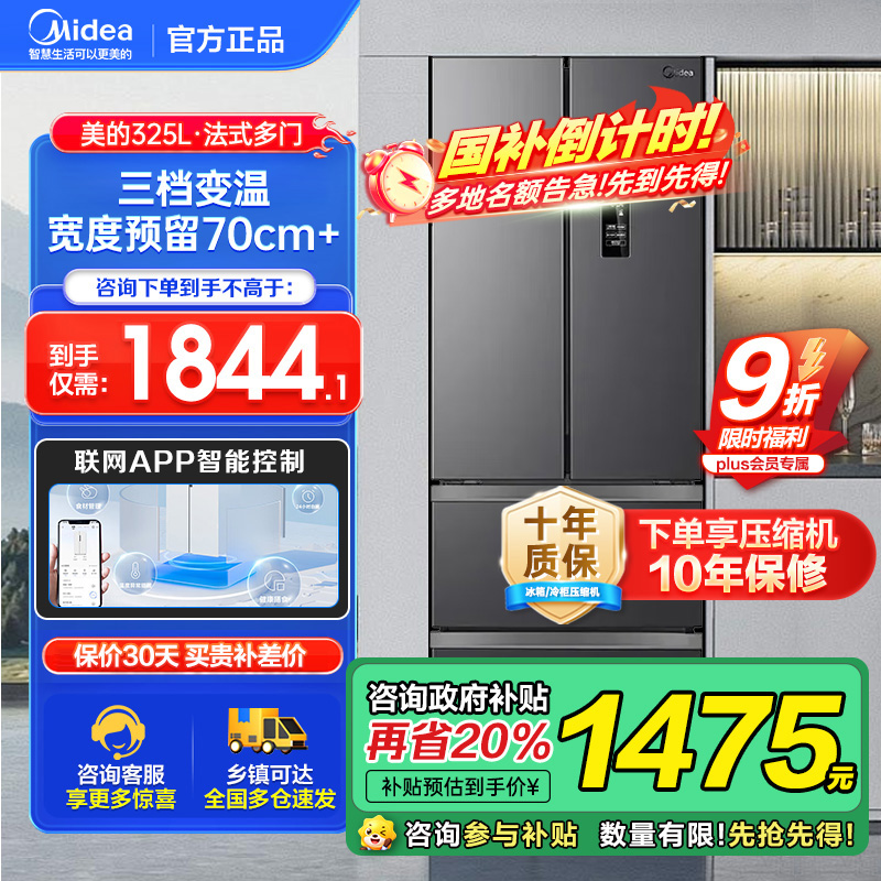 [自营]美的(Midea)325升法式多门冰箱一级能效双变频四开门电冰箱超薄风冷无霜节能低噪BCD-325WFPM(E)