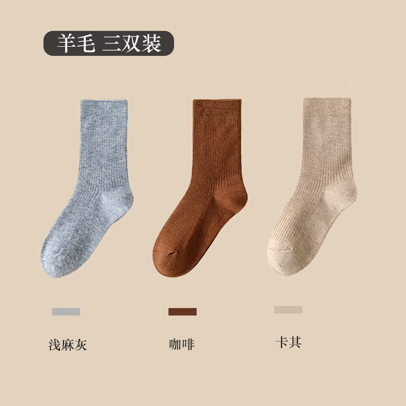 【3双装】猫人女士羊毛袜子中筒毛圈袜纯色时尚加厚保暖袜家居睡眠月子袜女 浅麻灰+咖啡+卡其 35-40码