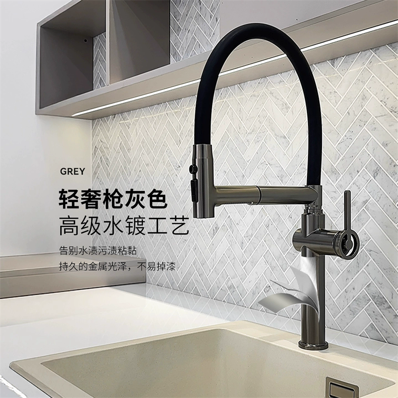 汉德斯科全铜厨房水龙头洗菜盆抽拉式水槽冷热洗碗磁吸万向旋转多出水龙头 枪灰色-磁吸飞雨