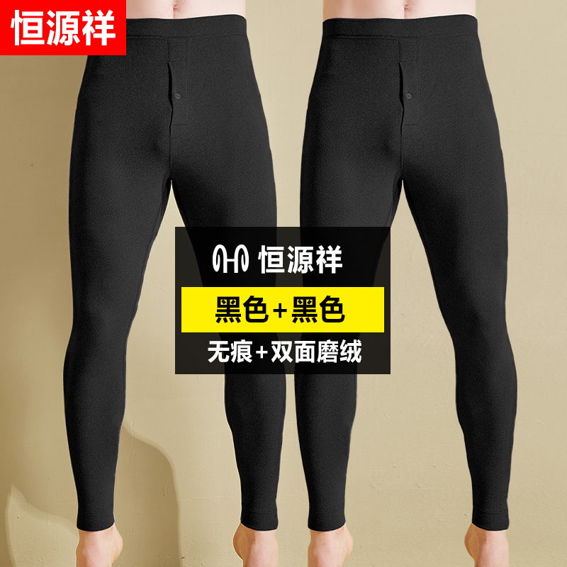恒源祥秋裤男士无痕发热内穿保暖裤冬季紧身薄款加绒打底裤 175(XL) 黑色+黑色