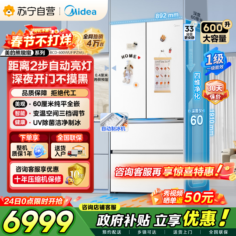 [自营]美的冰箱(Midea)熊墩墩Pro600法式双系统除菌一级能效制冰嵌入电冰箱BCD-600WUFIPZM(E)白