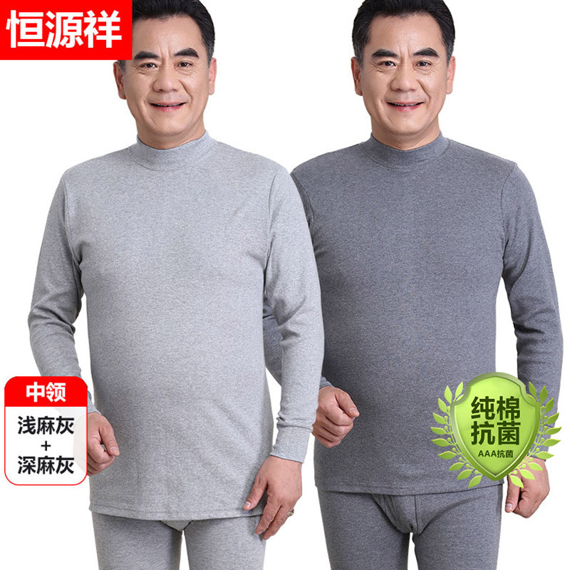 恒源祥爸爸秋衣秋裤男士纯棉套装薄款中老年人保暖内衣高领棉毛衫_738_730 170(L) 【2套装中领】深灰+浅灰