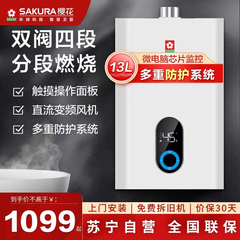 今天樱花13升燃气热水器已到,师傅很快到家安装好。使用了质量不错,比原来买的樱花12升有些性能有所改善,如果时间长开着的温度显示会跳掉,这点性能很好。目前使用水温稳定,出水量可以。樱花是老牌子了,值得购买!
