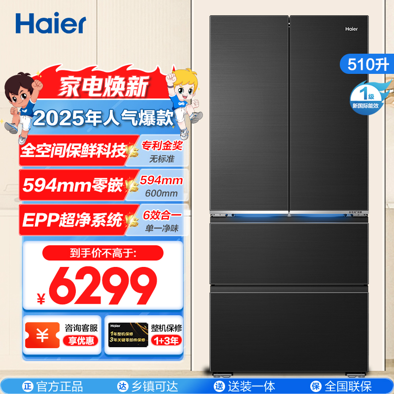 海尔冰箱嵌入柜子里很好看,容量大,噪音小,当天**,第二天就送到,物流快。