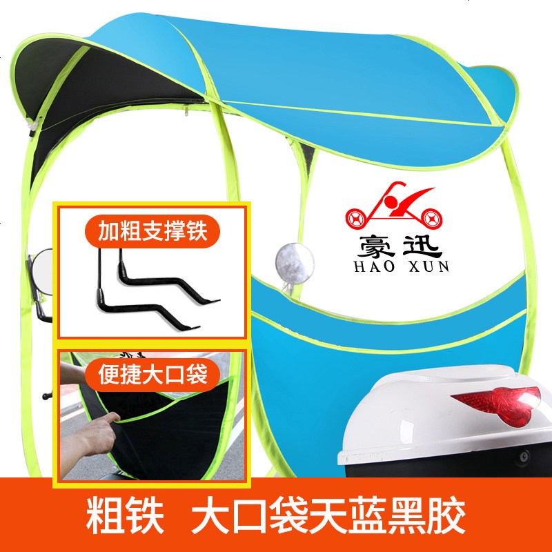 雅迪爱玛绿源新日车型通用电动摩托车挡雨棚篷蓬新款防晒防雨遮阳伞电瓶挡风罩加厚雨伞车棚 新大圆顶天蓝黑胶+粗铁+高度调节+大口袋