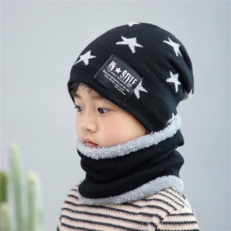 儿童帽子秋冬男童女童保暖护耳帽子围巾两件套装冬季毛线帽潮 黑色3-12岁均码有弹力