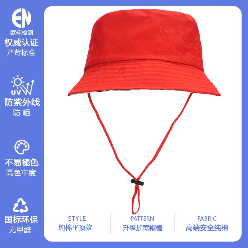 幼儿园小帽太阳帽儿童帽子小学生夏天渔夫帽 红色平顶双面棉(配可调节防风绳)58(三年级至成人)