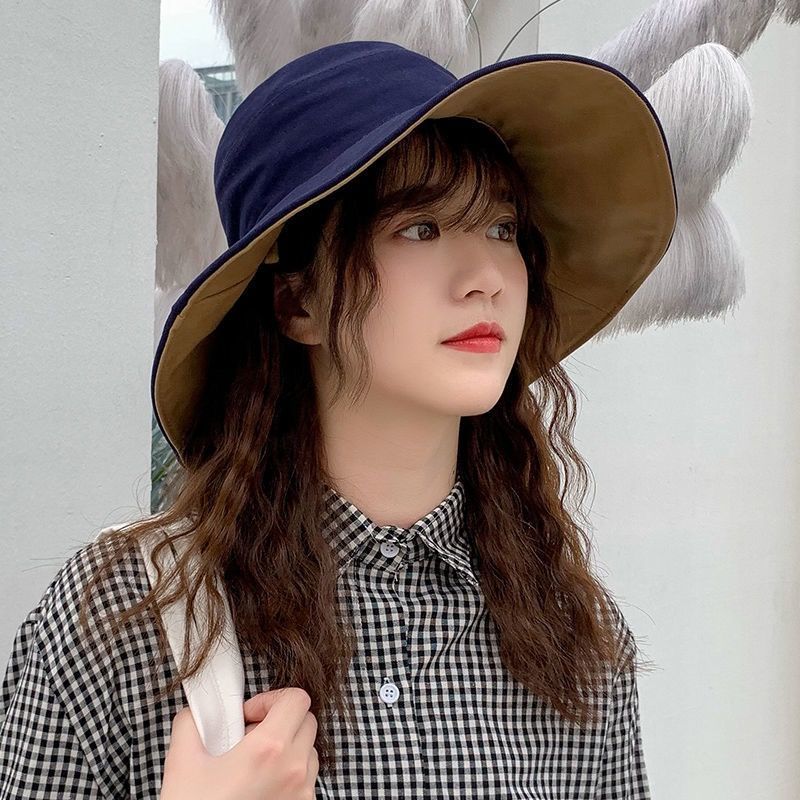 超大帽檐帽子女夏遮阳帽渔夫帽韩版防紫外线遮脸太阳帽潮 11厘米中帽檐【藏青色-米色】均码55-59厘米【赠送防风绳