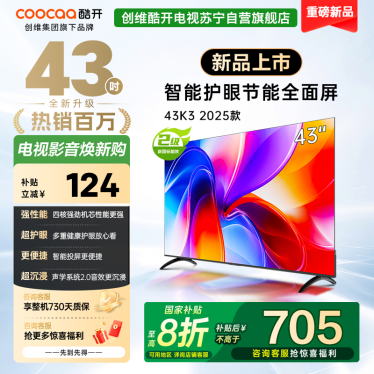创维酷开 43英寸节能护眼新款智能全面屏电视 高清投屏互联网电视 家用卧室老人电视小尺寸电视