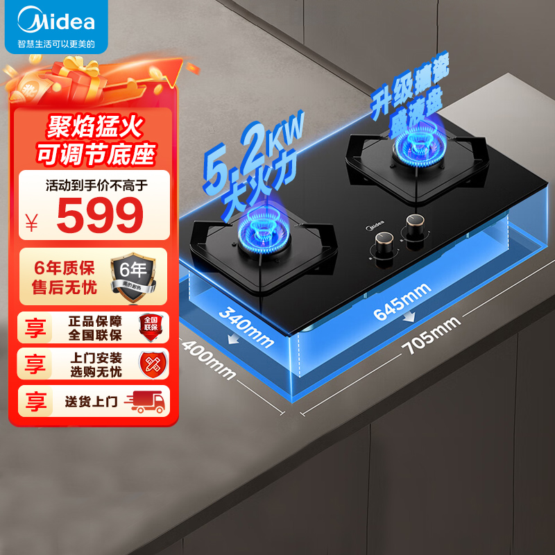 美的(Midea)燃气灶天然气 双灶具 家用5.2kW猛火聚能灶台嵌两用 搪瓷易打理 高能效灶 节能灶 Q529L-M