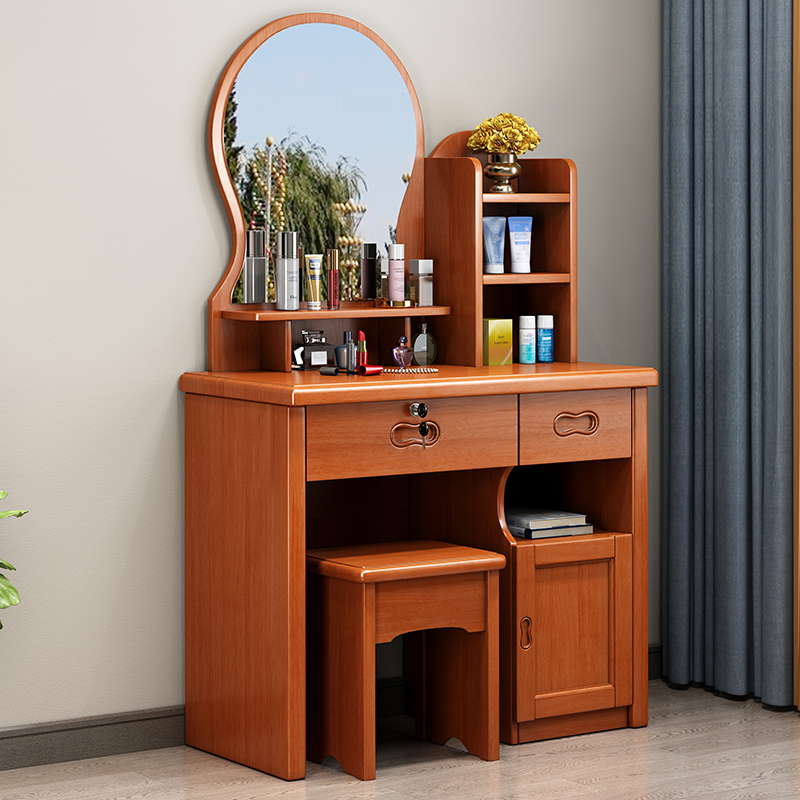 青木川 中式实木梳妆台化妆柜组合柜卧室房间90cm成人小户型带锁带妆镜雕花床边收纳储物柜一体简约现代 海棠色