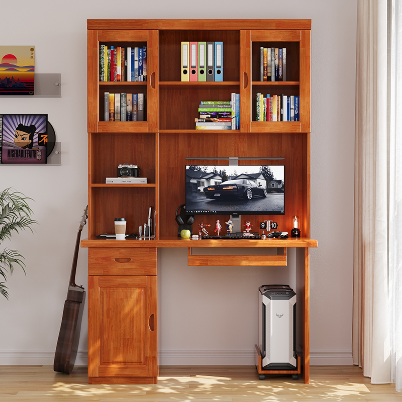 青木川 实木书桌带书架书柜一体落地客厅卧室房间书房中学生台式电脑桌办公桌学习写字桌简约现代中式 海棠色 长宽高:120*60*191厘米