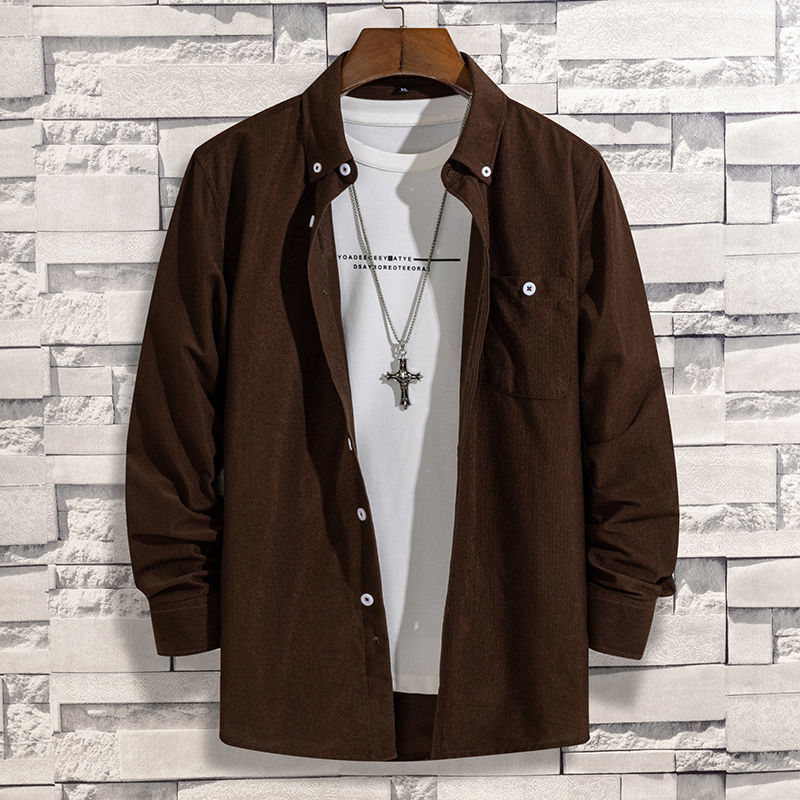 2021春秋款纯色磨毛有口袋青中老年长袖韩版修身灯芯绒宽松衬衫男 XL 咖啡色