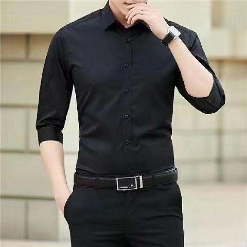 新款黑色微弹衬衫男长袖韩版坠感制服外套春秋季休闲男装白衬衣_276_213 M(90-105斤) 七分袖(黑色)高质量微弹