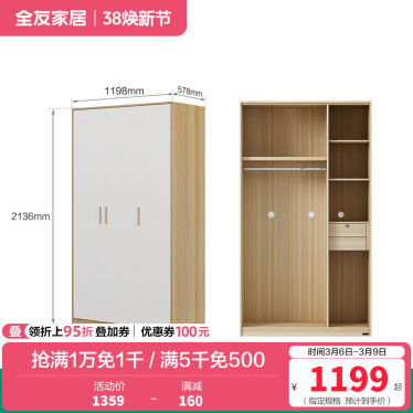 全友家居北欧现代三门衣柜 清新木纹带L灯储物收纳衣橱卧室整体家具 【腊木木纹A款】三门衣柜