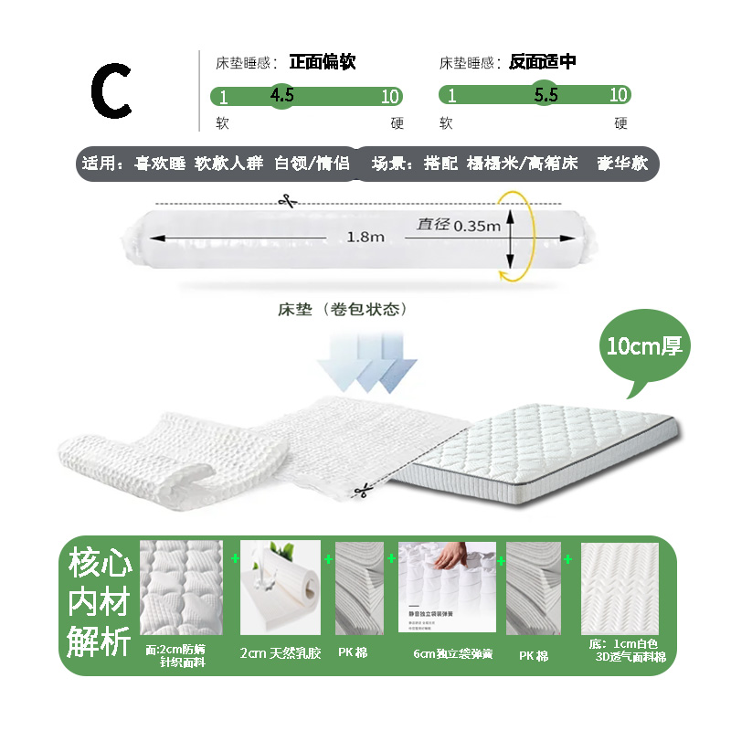 云梦云压缩卷包床垫乳胶记忆棉弹簧卷包床垫酒店民宿榻榻米床垫 10cm厚6cm弹簧+2cm天然乳胶+防螨针织 180*200cm
