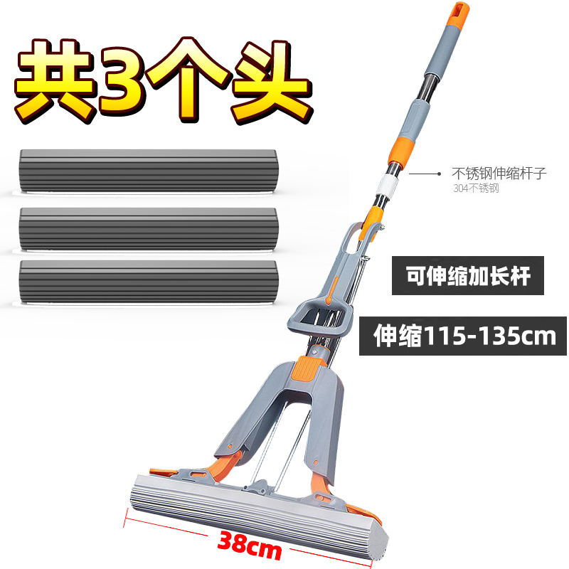 海绵拖把免手洗2025新款一拖家用吸水地拖墩布胶棉头净对折挤水式 四重双翼挤水加大38cm-共带3个棉头-北欧蓝