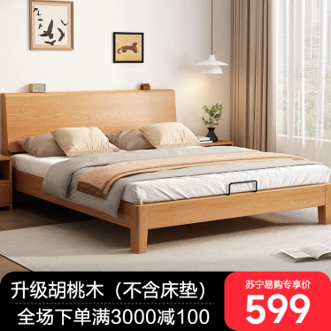 胡桃木床 全实木床 双人床 现代简约单人床出租房床架主卧大床家用1米8双人床 原木色床 1.8*2米【自己安装】