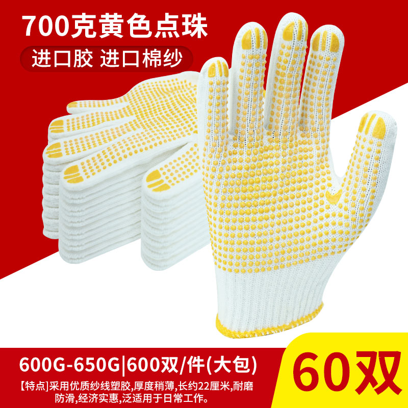 手套手套劳保工作耐磨点胶工地干活防滑线胶透气耐磨点珠棉线手套男女 荧光黄 均码