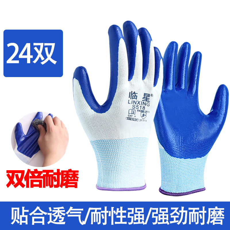劳保手套乳胶橡胶丁晴手套工作防滑防水耐磨胶皮发泡挂胶工地干活 双倍耐磨临星蓝色(24双) 均码