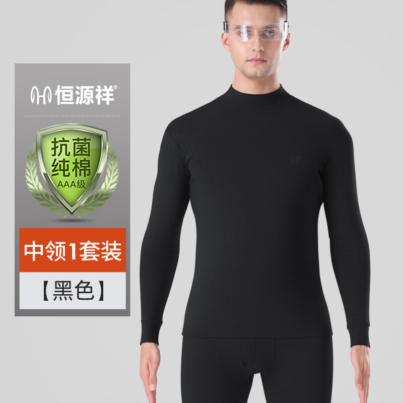 恒源祥男士秋衣秋裤套装冬纯棉保暖内衣男棉毛衣全棉衬衣衬裤_637 175/XL【170-175cm,65-75公斤】 【纯棉】中领-黑色【单套】