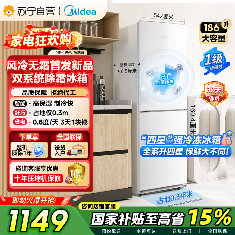 美的极地白196双门冰箱MR-196W 1级能效186升大容量独立式节能低音电脑控温三星级冷冻