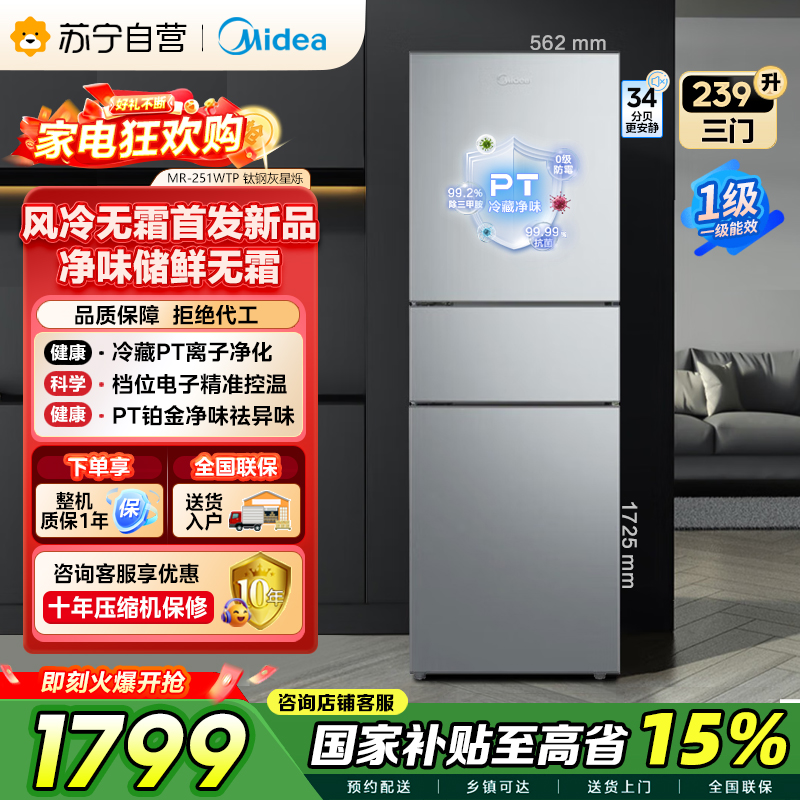 美的钛钢灰三门变频冰箱MR-251WTP 239升电脑控温节能侧开独立式小户型家电